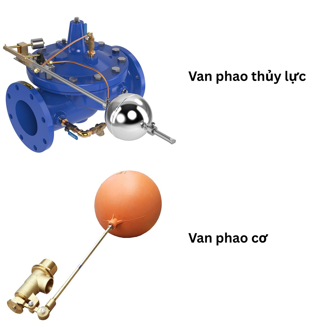 • Van phao thủy lực (Remote Control Float Valve): Sử dụng một van pilot nhỏ điều khiển áp suất trong buồng chứa màng van. Loại này thường bằng gang, lắp bích, dùng cho các bể chứa khổng lồ trong khu công nghiệp hoặc tòa nhà cao tầng.